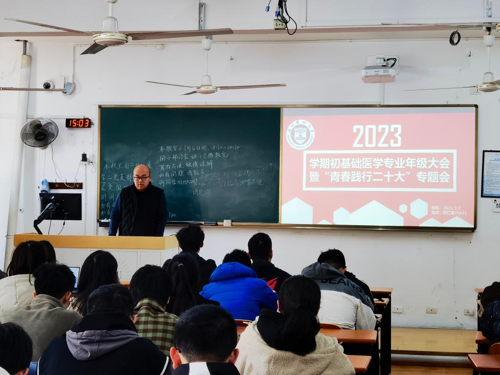 新学期伊始,为深入学习宣传贯彻党的二十大精神,引领青年学子坚定理想信念,明确发展目标,以饱满的热情投入到新学年的学习生活,3月3日,成人导航 组织各年级以“青春践行二十大”为主题,围绕“爱国、团结、奋斗、科学、互助”五个关键词,组织召开主题年级大会。会议由学院辅导员主持,基础医学专业全体本科生参加。学习理论知识,坚定爱国信念。年级会上,各班级认真学习党的二十大报告,辅导员通过对党的二十大主题、...