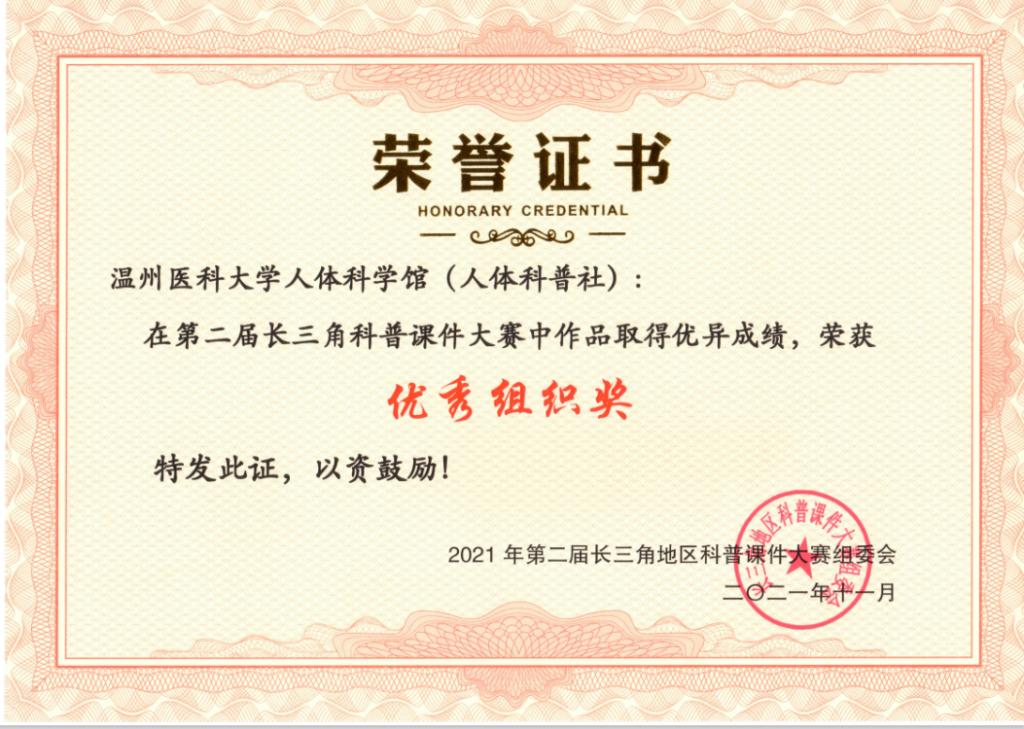 在2021年第二届长三角地区科普课件大赛中,成人导航 人体科学馆、人体科普社取得佳绩。近日,收到了来自温州市科协科普部寄送的获奖证书。此次赛事,人体科普社共报送了6个作品,其中作品《预防颈椎病,向“低头族”说拜拜》荣获一等奖,《疫苗!到底该不该》荣获三等奖,《有关鼻子的那些事儿》《5G+医学(远程手术)》获入围奖,成人导航 人体科学馆(人体科普社)获评“优秀组织奖”。据悉,长三角地区科普课件大赛由...