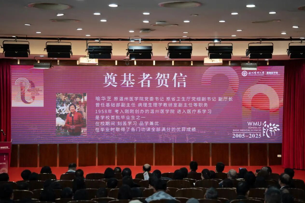 原温州医学院党委书记、原省卫生厅党组副书记、副厅长、病理生理学专家喻华芝老师为院庆发来贺词。作为1958年首届学生,她深情回忆了建校之初师生在艰苦条件下共同劳动、建设校园的难忘岁月,并对姜起立、王维松、王务迪、朱金昌等首批基础学科奠基人严谨生动的教学表达了崇高敬意与感激。她欣慰于学院二十年来取得的丰硕成果,并衷心祝愿学院继续发扬校训精神,传承创业传统,培养更多德才兼备的优秀人才,为人民健康事业贡献更大力量。