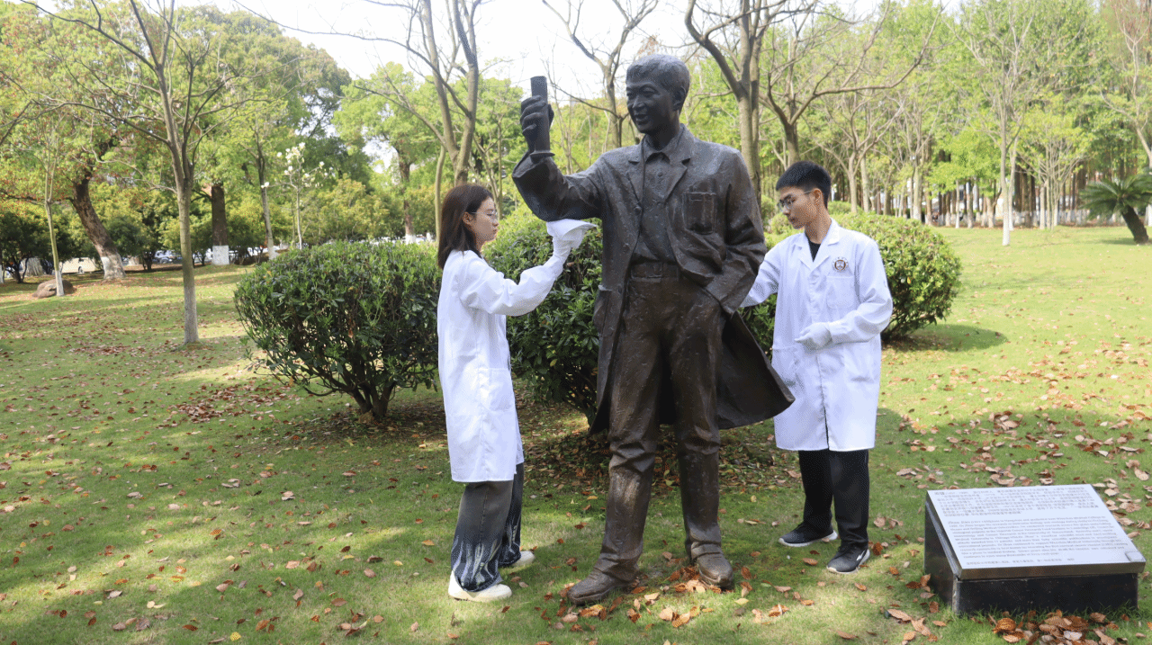 师生在茶山校区周健博士铜像前举行“敬仰 追思”活动。成人导航
