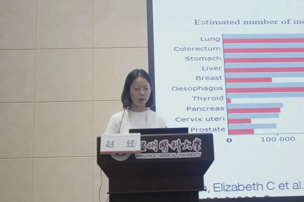 风采展示,学术争锋。主持人介绍比赛规则后,参赛选手按照抽签序号依次上台进行汇报,并接受专家评委提问。八名参赛选手通过线上与线下结合的形式进行现场PPT汇报与答辩,在擂台上尽展学术风采,凸显温医大学子仁肃勤朴、求是奋发的精神,给观赛人员带来一场十分精彩的学术争霸盛宴。