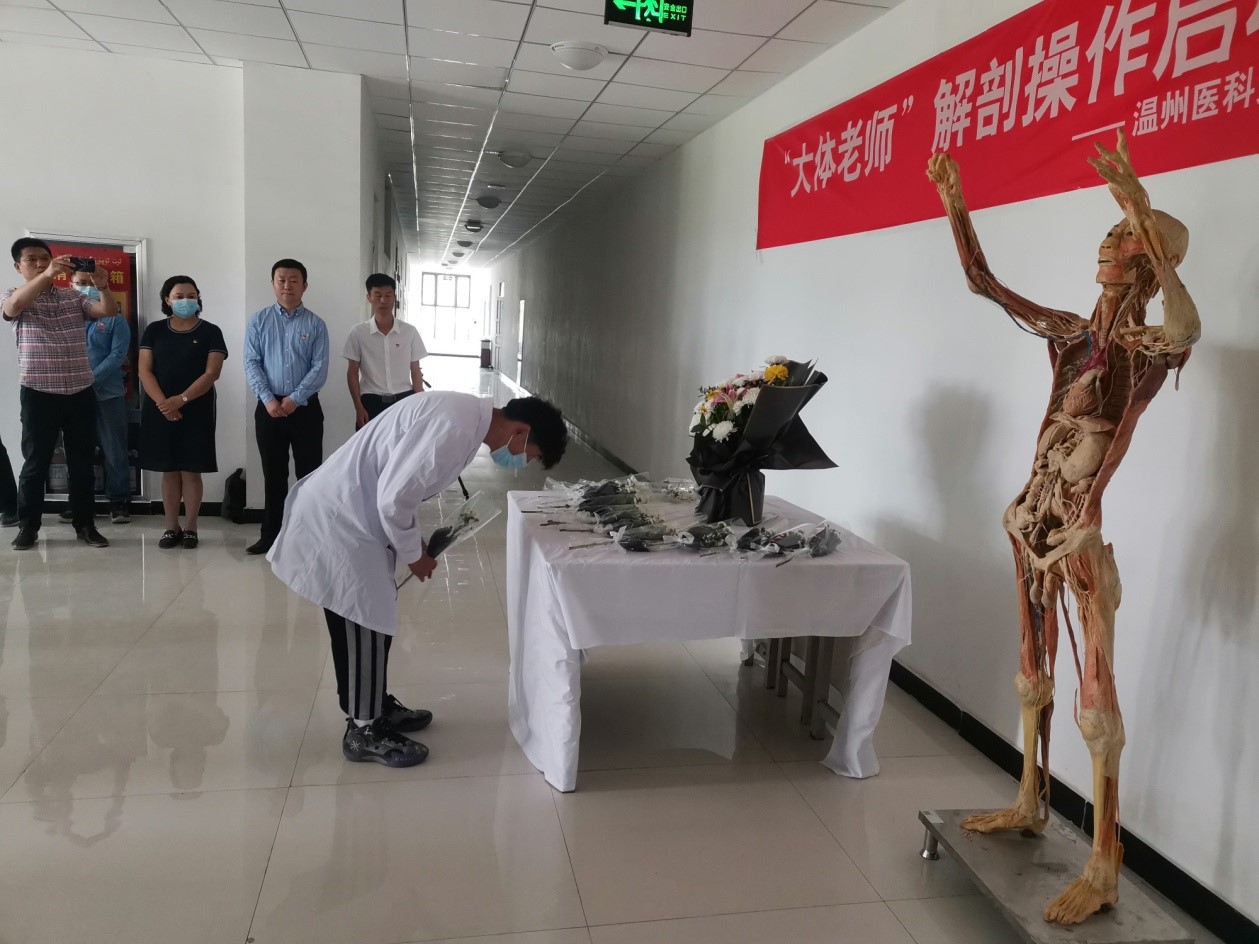 阿职院医学院党总支刘萍书记指出,解剖学是医学生接触的第一门专业基础课,是一堂以死亡为开始的生命教育,也是初识生命构造的起点。大体老师是唯一一个死亡后获得的职业,他的高尚无法用语言或者是文字去表达。它的庄严无法用词汇或者其他去修饰。