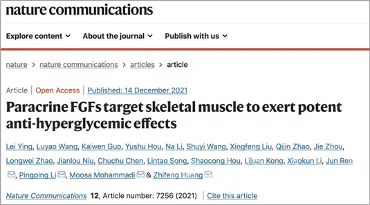 12月14 日,成人导航 汪洋课题组青年教师应磊的研究成果“Paracrine FGFs target skeletal muscle to exert potent anti-hyperglycemic effects”在Nature旗下知名期刊Nature Communications(自然——通讯,IF:14.919)以研究长文形式在线发表。该研究揭示了旁分泌蛋白FGF4通过上调骨骼肌葡萄糖转运体4细胞膜转位,降低二型糖尿病(type 2 diabetes,T2D)小鼠血糖的作用及分子机制,为T2D及相关代谢紊乱的防治提供了新的策略和方...