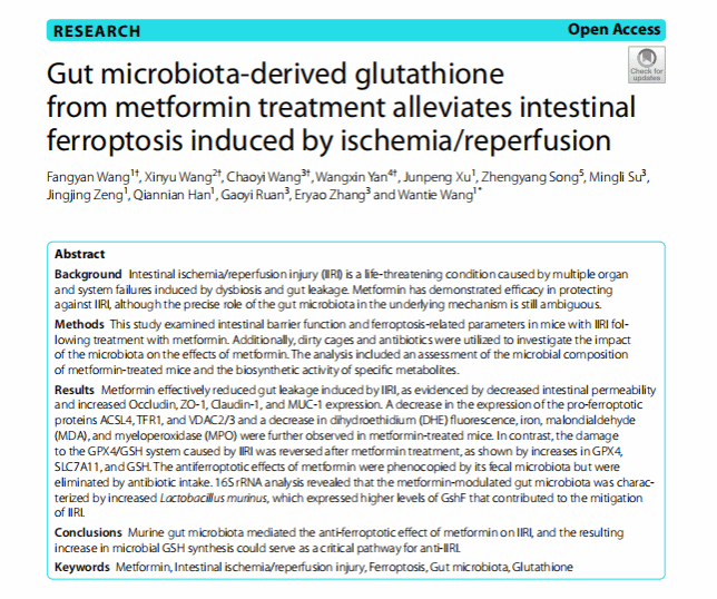 近日,成人导航 微生物与宿主炎症相关疾病研究所及缺血-再灌注损伤研究所王万铁教授团队和王方岩副教授团队在医学领域国际权威期刊《BMC Medicine》(中科院1区,TOP期刊,五年影响因子8.8分)在线发表了题为《Gut microbiota-derived glutathione from metformin treatment alleviates intestinal ferroptosis induced by ischemia/reperfusion》的重要研究成果。该研究揭示了二甲双胍通过调节肠道菌群增强菌源性谷胱甘肽(GSH)...